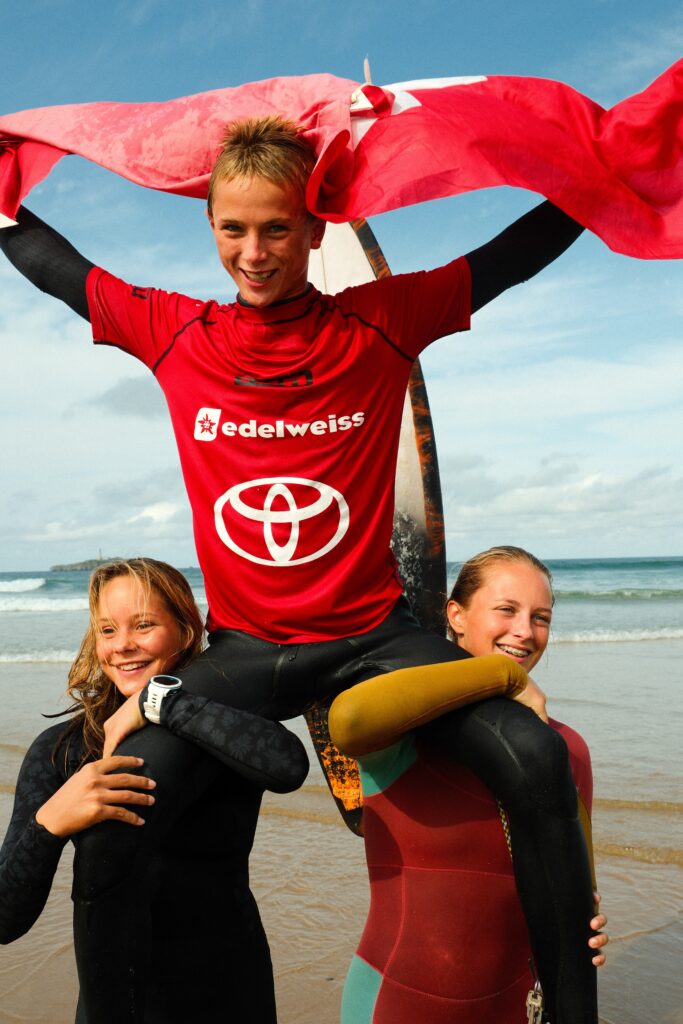 Bei den Open Men wird hart gekämpft. Rivan Rock Rosskopf, der sich hauptsächlich hawaiianische Wellen gewöhnt ist, zeigt deutlich, dass er diesen Sommer viel Zeit am Atlantik verbracht hat. Fantin Habashi hat die Runde 3 der Open Men mit 16 Punkten, dem höchsten Heat Total des Tages, abgeschlossen. Und die jüngeren Brüder Kilian Rosskopf und Antoine Habashi durften sich schon in Runde 3 battlen. Ob es wieder ein Brüderduell im Finale gibt, zeigt sich morgen in den Semifinals. Kilian Rosskopf wird ebenfalls die U18 Finals surfen und dort von den Jüngeren geschlagen werden wollen.