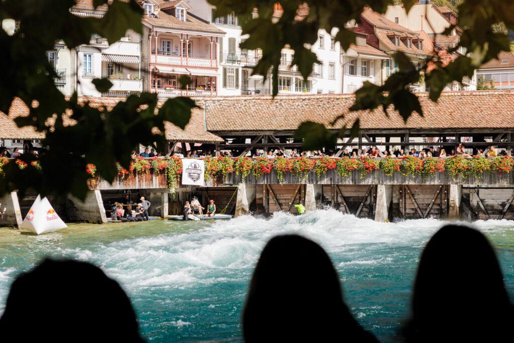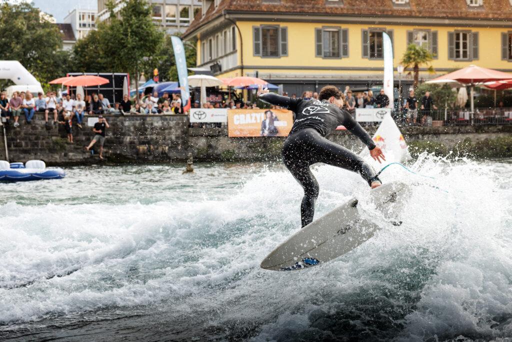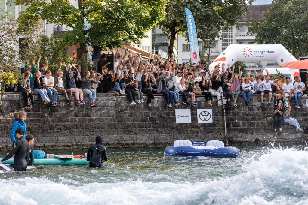 Doch der Riversurf Jam war weit mehr als nur ein sportliches Highlight. Rund um die Welle verwandelte sich die Thuner Altstadt in ein kleines Surf-Festival: Das Surf Village auf dem Waisenhausplatz und der Mühlebrücke bot Marktstände, Streetfood und chillige Atmosphäre. Ramon Clau sorgte mit Strassenmusik für gute Vibes, bevor DJ Badawan am Abend für den perfekten Ausklang sorgte. Eine Yoga-Session am Mittag rundete das vielseitige Programm ab.